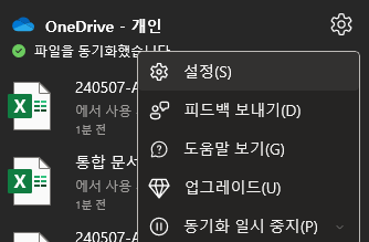 1. 작업 표시줄에서 OneDrive에서 오른쪽 클릭, 톱니바퀴 선택후 설정에 들어가