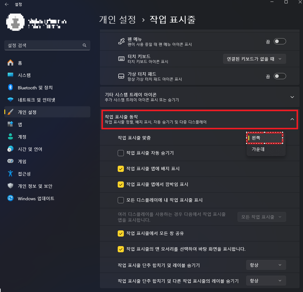 그리고 "작업 표시줄 동작" 클릭 -> 바로 밑에 "작업 표시줄 맞춤" 선택에서 가운데에서 "왼쪽"으로 선택해