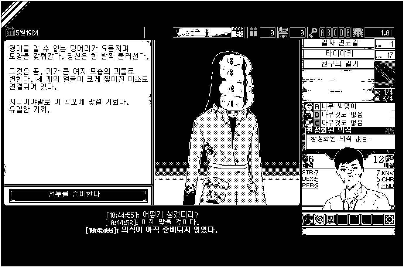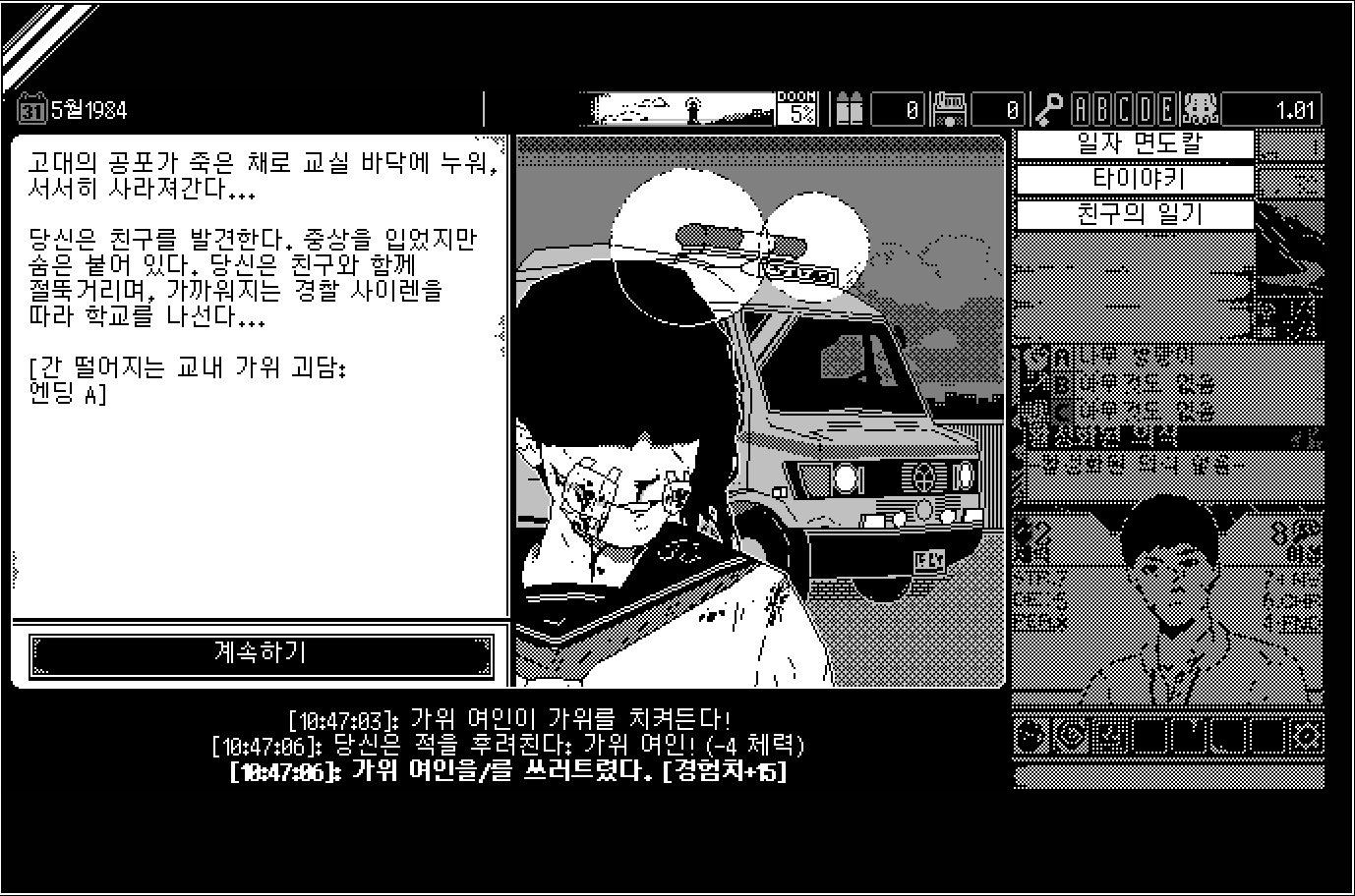 그림체는 단순 만화체 같은데, 오히려 이게 더 무섭게 느껴집니다. 특히 정신력이 깎일 때마다 주인공이 점점 미쳐가는 묘사가 아주 소름 돋는 게입니다.