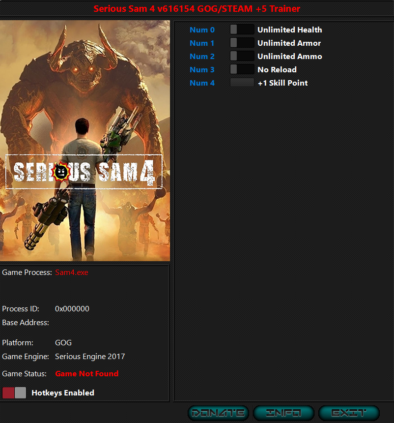 시리우스 샘 4 (Serious Sam 4 v616154 GOG/STEAM +5) 트레이너 Num 0 - 무한 체력 Num 1 - 무한 방어 Num 2 - 무한 총알 Num 3 - 재장전 없음Num 4 - 스킬 포인트 +1 게임 트레이너 및 모드 2025.04.08