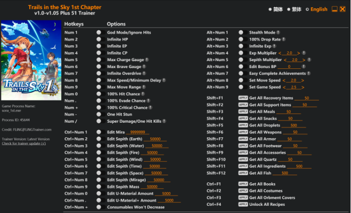 게임 트레이너 옵션키설명Num 1신 모드 / 피해 무시Num 2무한 체력Num 3무한 스태미나Num 4무한 에너지Num 5무한 영양 수치Num 6부상 없음Num 7낙하 피해 없음Num 8무게 0Num 9적 스태미나 순삭Num 0극대화 피해 / 한 방 처치Num .피해 배율Num +방어 배율컨트롤 + 숫자키 (Ctrl+Num)키 조합설명Ctrl+Num 1돈 수정Ctrl+Num 2클릭한 아이템 수량 조정Ctrl+Num 3아이템 내구도 & 신선도 무한Ctrl+Num 4구명주(구원 스냅스) 없이 저장Ctrl+Num 5게임 속도 설정Ctrl+Num 6이동 속도 설정Ctrl+Num 7점프 높이 설정Ctrl+Num 8낮 시간 정지Ctrl+Num 9시간 흐름 속도 조절Alt + 숫자키 (Alt+Num)키 조합설명Alt..