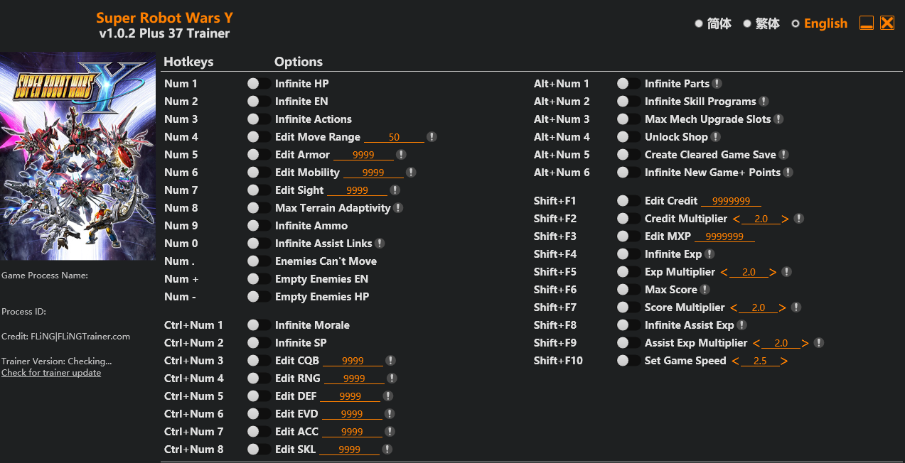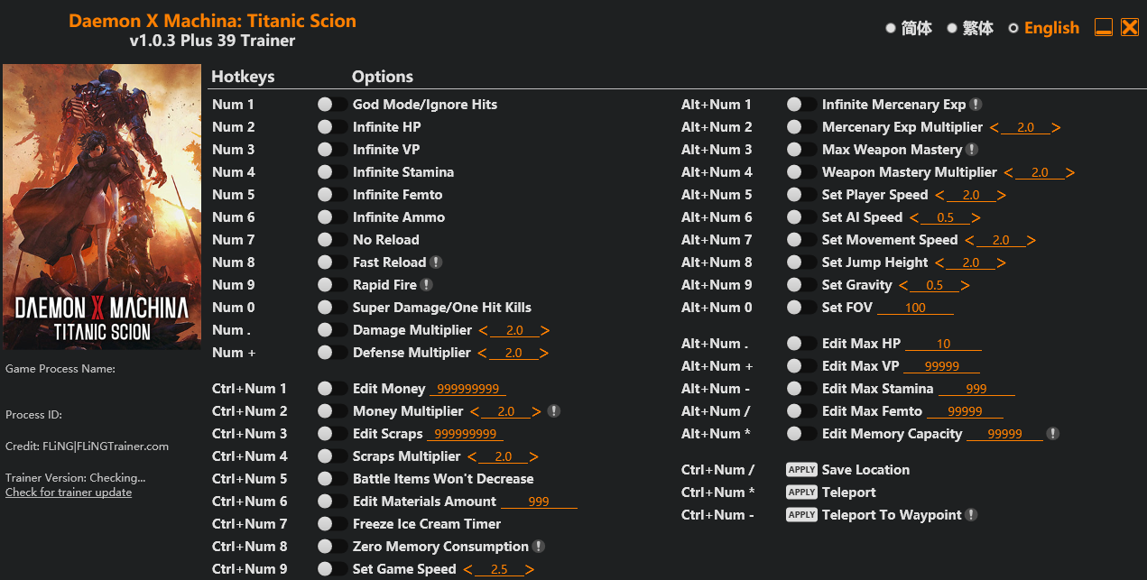 게임 트레이너 기능 숫자패드 키:숫자패드 1 – 신 모드/타격 무시숫자패드 2 – 무한 체력숫자패드 3 – 무한 VP숫자패드 4 – 무한 스태미나숫자패드 5 – 무한 펨토숫자패드 6 – 무한 탄약숫자패드 7 – 재장전 없음숫자패드 8 – 빠른 재장전숫자패드 9 – 연사숫자패드 0 – 슈퍼 데미지/원 히트 킬숫자패드 . – 데미지 배수숫자패드 + – 방어력 배수Ctrl + 숫자패드 키:Ctrl+숫자패드 1 – 돈 편집Ctrl+숫자패드 2 – 돈 배수Ctrl+숫자패드 3 – 전투 아이템 감소 없음Ctrl+숫자패드 4 – 재료 개수 편집Ctrl+숫자패드 5 – 아이스크림 타이머 고정Ctrl+숫자패드 6 – 메모리 소모 없음Ctrl+숫자패드 7 – 게임 속도 설정Ctrl+숫자패드 8 – 이동 속도 설정Ctrl+..
